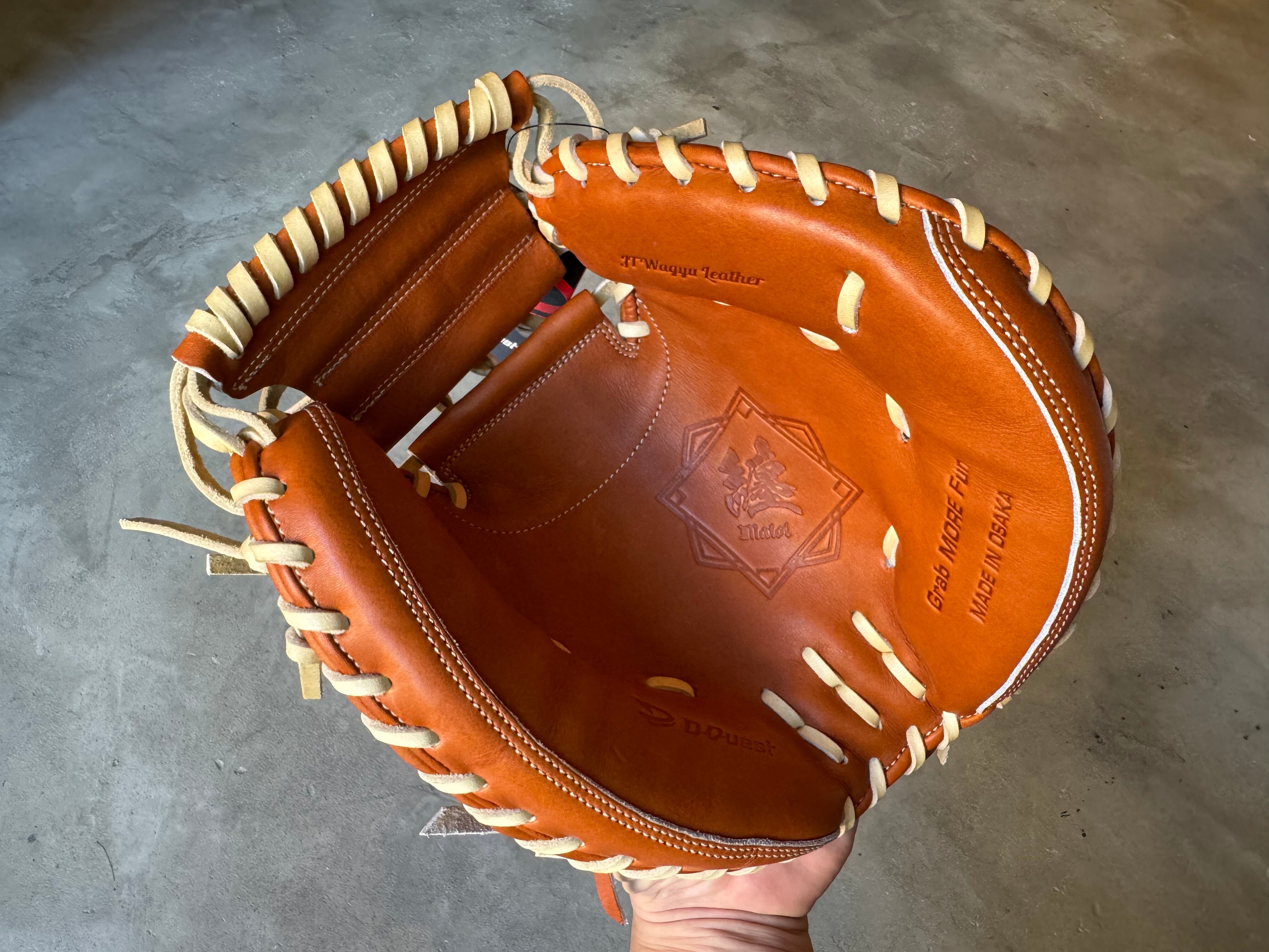 ※写真1〜4枚目は型付けイメージです。 キャッチャーミット専門シリーズ[纏] “JT Wagyu Leather”採用 型番:JWM-122 親指側にポケットを設計した少しコンパクトなキャッチャーミット。操作性を高め、送球動作れ移行出来るモデル。 サイズ:大きさ(中程度)深さ(中程度) 新型[D-Frex Band+]採用でフィット感と屈曲性UP! ポジション:捕手 本体カラー:Tブラウン 紐カラー:Cブラウン ステッチカラー:キャメル ラベル:ゴールド×プラチナ×ブラック 専用グラブ袋:有 中学・高校野球使用:可 ○“JT Wagyu Leather”採用 キャッチャーミット専用の和牛レザーを採用。 和牛特有の“ハリ”が生み出す捕球音で投手の士気を上げる。また高い耐久性は最も捕球頻度が高いキャッチャーミットに適している。 ○プラチナラベル Dマーク縁部分にプラチナカラーを採用。 ステップアップした選手たちに似合う高級感を表現。 ○豊富な型数 大きめ、小さめ、浅め、深めと1型1型形状を変え、選択肢を取り揃えた。 あなたにとってベストなミットが見つけられる。 使えば使うほど手に馴染み、共に成長していくこのグラブで、ファクトリーブランド D-questのものづくりに対する思いの強さをご体感ください。 D-Questは世界で活躍する一流選手のグラブをつくる工房。 その職人が編んだグラブで、軽快な捕球と成長をサポートします。 ※送料無料 ※型付け有の場合、加工期間に1週間程度かかる可能性がございます。予めご了承下さい。 追加で確認する事項がありましたらメールにてご連絡する事がございます。 ※柔らかさの目安(個人差はございます) 「硬め」・・・形を整える程度。お客様ご自身で柔らかくしていくイメージ。 「普通」・・・キャッチボールが出来る程度。多少の開閉ができるイメージ。 「柔らかめ」・・・ノックなど受けれる程度。しっかり開閉できるイメージ。