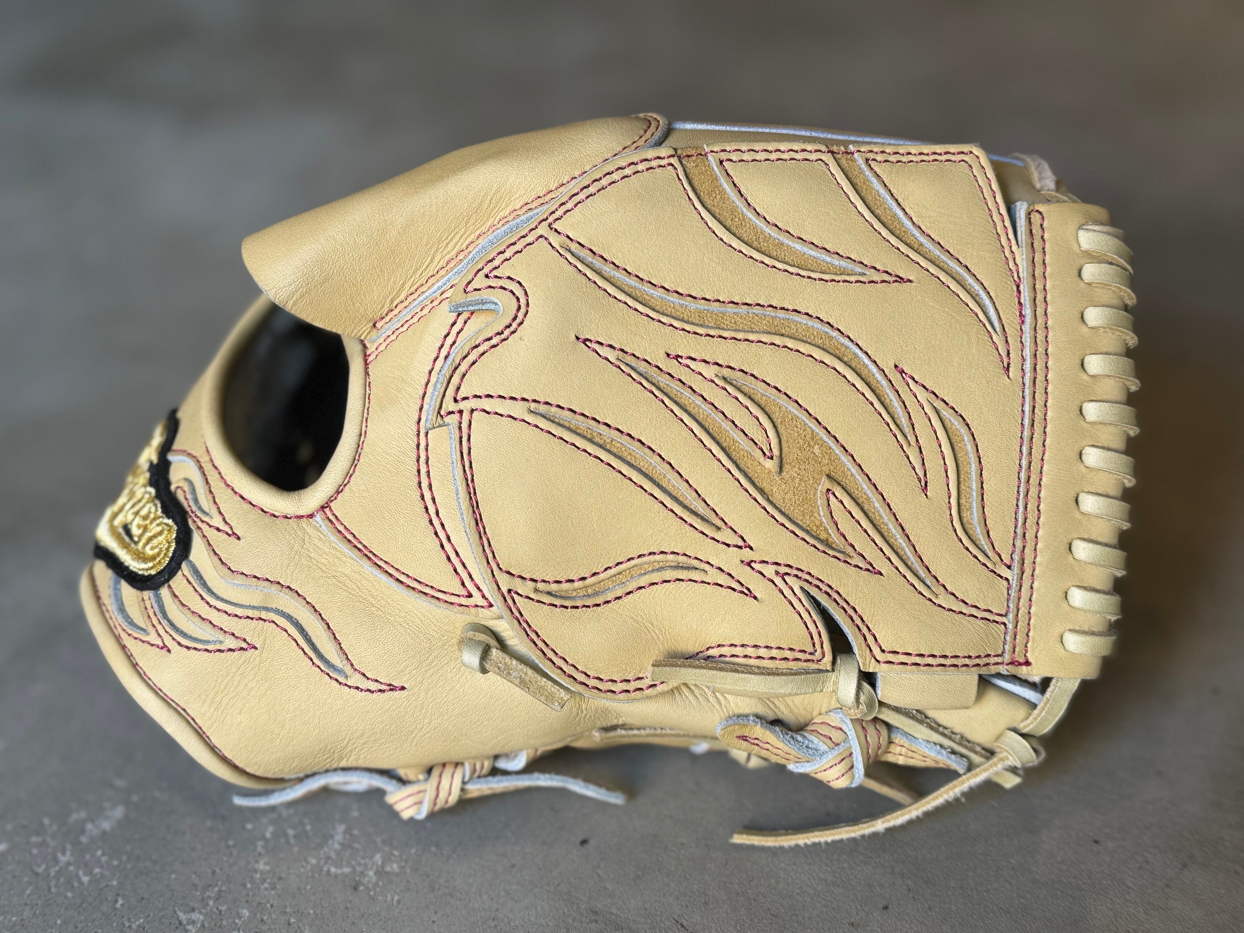 NEWウェブ登場‼︎ 今季限定の[T6]ウェブ! 燃え上がる炎の様なスタイリッシュな模様が特徴的。 型番:MIE-P TEPPEN人気の内野手用[MIE-P]を投手用仕様に変更。約28.5cm。 コンパクトな投手用グラブで、フィールディングもしやすい。また、小ぶりなサイズ感の為、投球時のバランス感も向上!安定したピッチングをサポート! ポジション:投手 本体カラー:ブロンド ヒラウラカラー:ブラック ヒモカラー:ブロンド ステッチカラー:レッド ラベル:ゴールド×ブラック 専用グラブ袋:有 ボーイズ・ヤング・高校野球使用:可 TEPPENはじめ氏『至極仕上げ』 TEPPENのグラブは、はじめ氏が魂を込めて形を整えて店舗に入荷してくる。 質感、手馴染みの良さも健在のTEPPENレザーも相まって良いグラブに仕上がってます。 ⭐︎自分だけのTEPPENグローブを作ろう! こちらのECサイトでは、TEPPENグローブのオーダーも受付可能です。 納期は2ヶ月半〜3ヶ月ほど。 お気軽にご相談下さい。 ※送料無料 ※型付け有の場合、加工期間に1週間程度かかる可能性がございます。予めご了承下さい。 追加で確認する事項がありましたらメールにてご連絡する事がございます。 ※柔らかさの目安(個人差はございます) 「硬め」・・・形を整える程度。お客様ご自身で柔らかくしていくイメージ。 「普通」・・・キャッチボールが出来る程度。多少の開閉ができるイメージ。 「柔らかめ」・・・ノックなど受けれる程度。しっかり開閉できるイメージ。 ※グラブ刺繍は、平裏土手部のみ可能。ご利用の際はグラブ刺繍ページをご確認下さい。 (メニューバー→カテゴリ→グラブ刺繍)