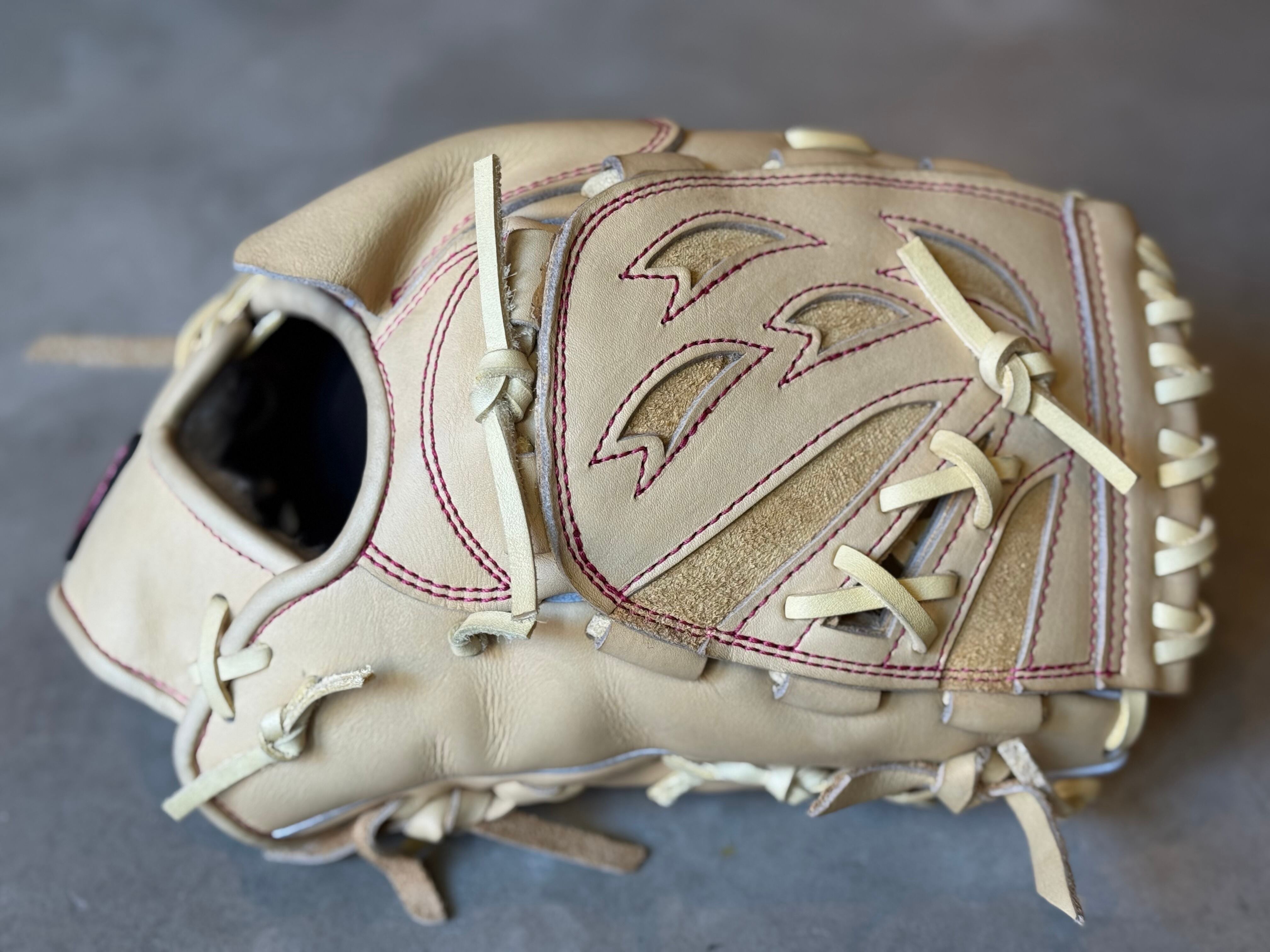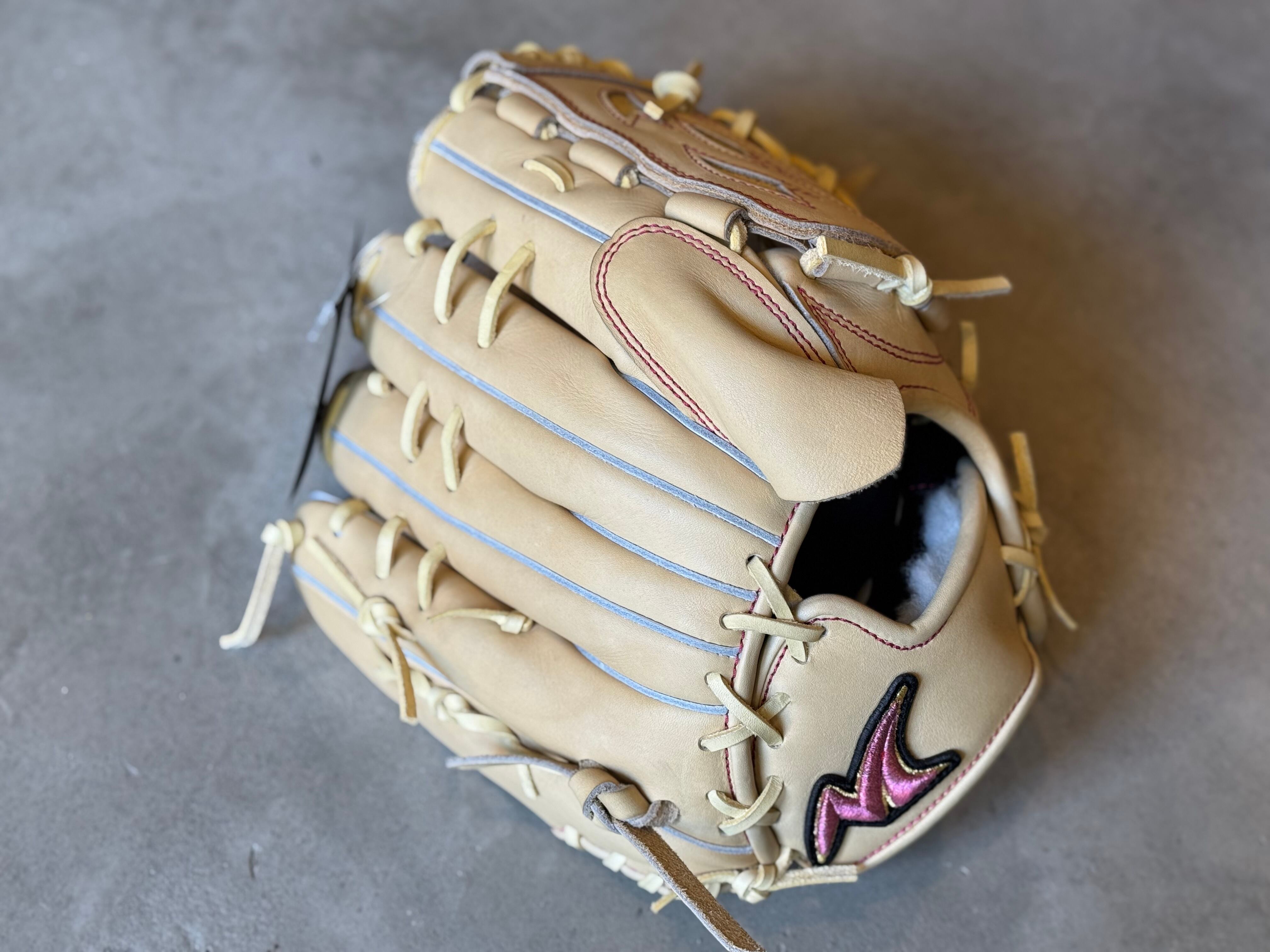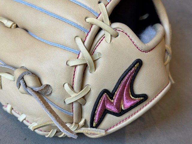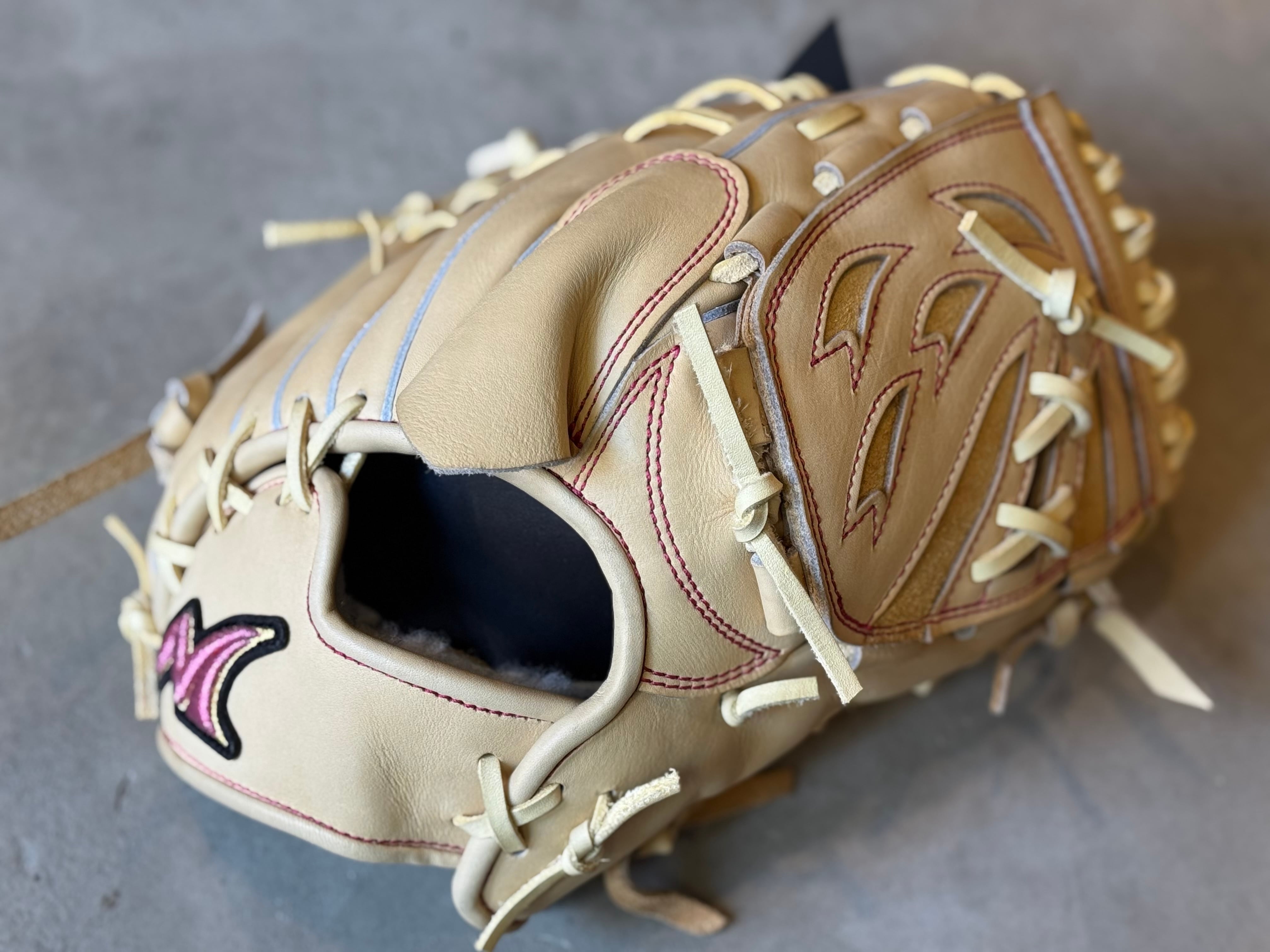 ガイド型付け済 型番:KSR-01 約30.0cmのオーソドックスなサイズ感の投手用モデル。手首を覆うバンドスタイルを採用し、フィット感を高めたモデル。若干横気味に握りやすい設計。 ポジション:投手 本体カラー:キャメル ヒラウラカラー:ブラック ヒモカラー:キャメル ステッチカラー:ピンク ラベル:ピンク×ゴールド×ブラック 専用グラブ袋:有 ボーイズ・ヤング・高校野球使用:可 〜KSRシリーズ〜 ウェブに使用する革を3枚層にし、革を漉かず厚めの状態でウェブを作製。さらに通常のウェブサイズより一回り大きくしており、存在感あるBIGウェブになっている。 ※送料無料 ※型付け有の場合、加工期間に1週間程度かかる可能性がございます。予めご了承下さい。 追加で確認する事項がありましたらメールにてご連絡する事がございます。 ※柔らかさの目安(個人差はございます) 「硬め」・・・形を整える程度。お客様ご自身で柔らかくしていくイメージ。 「普通」・・・キャッチボールが出来る程度。多少の開閉ができるイメージ。 「柔らかめ」・・・ノックなど受けれる程度。しっかり開閉できるイメージ。 ※グラブ刺繍は、平裏土手部のみ可能。ご利用の際はグラブ刺繍ページをご確認下さい。 (メニューバー→カテゴリ→グラブ刺繍)