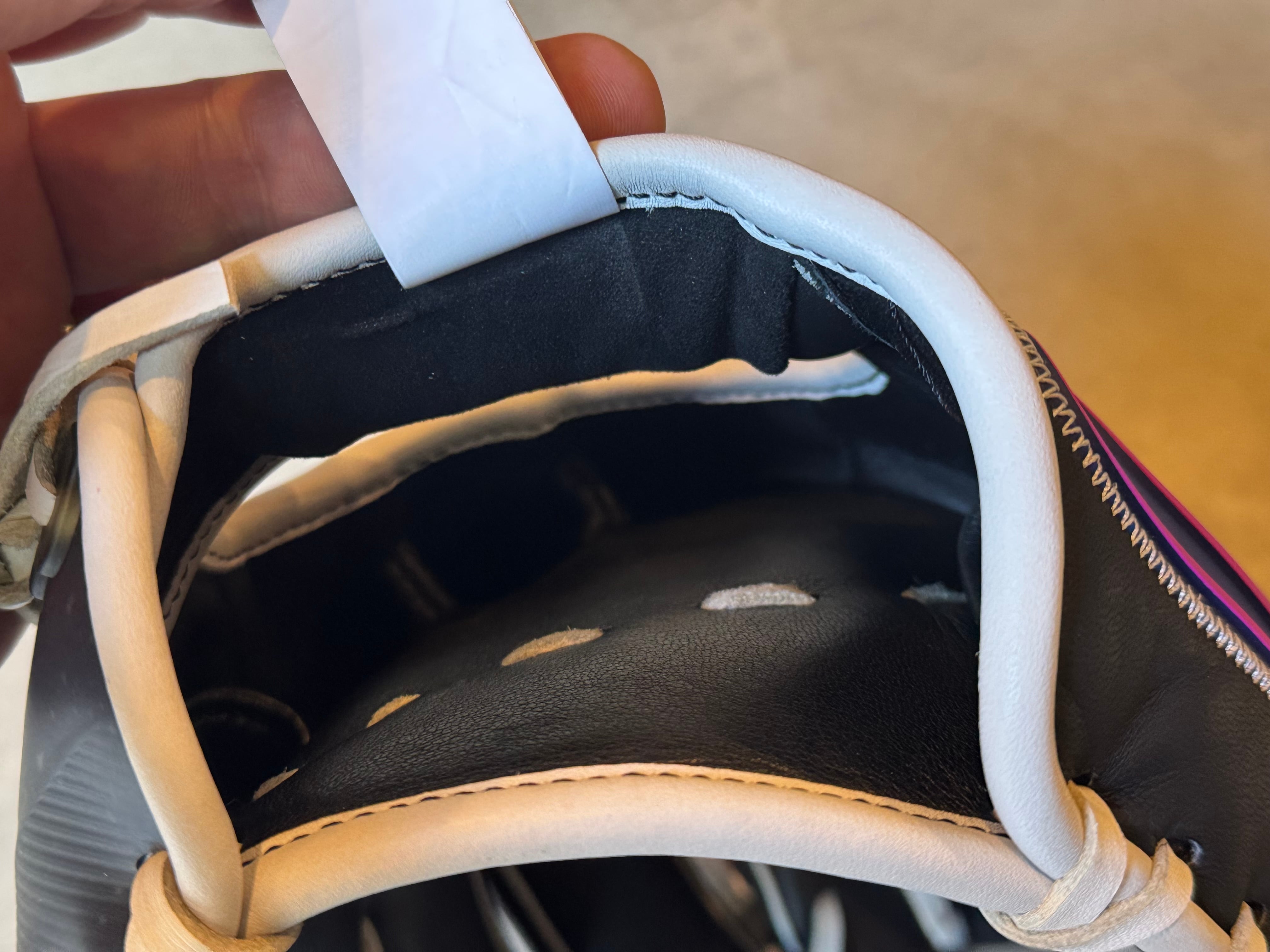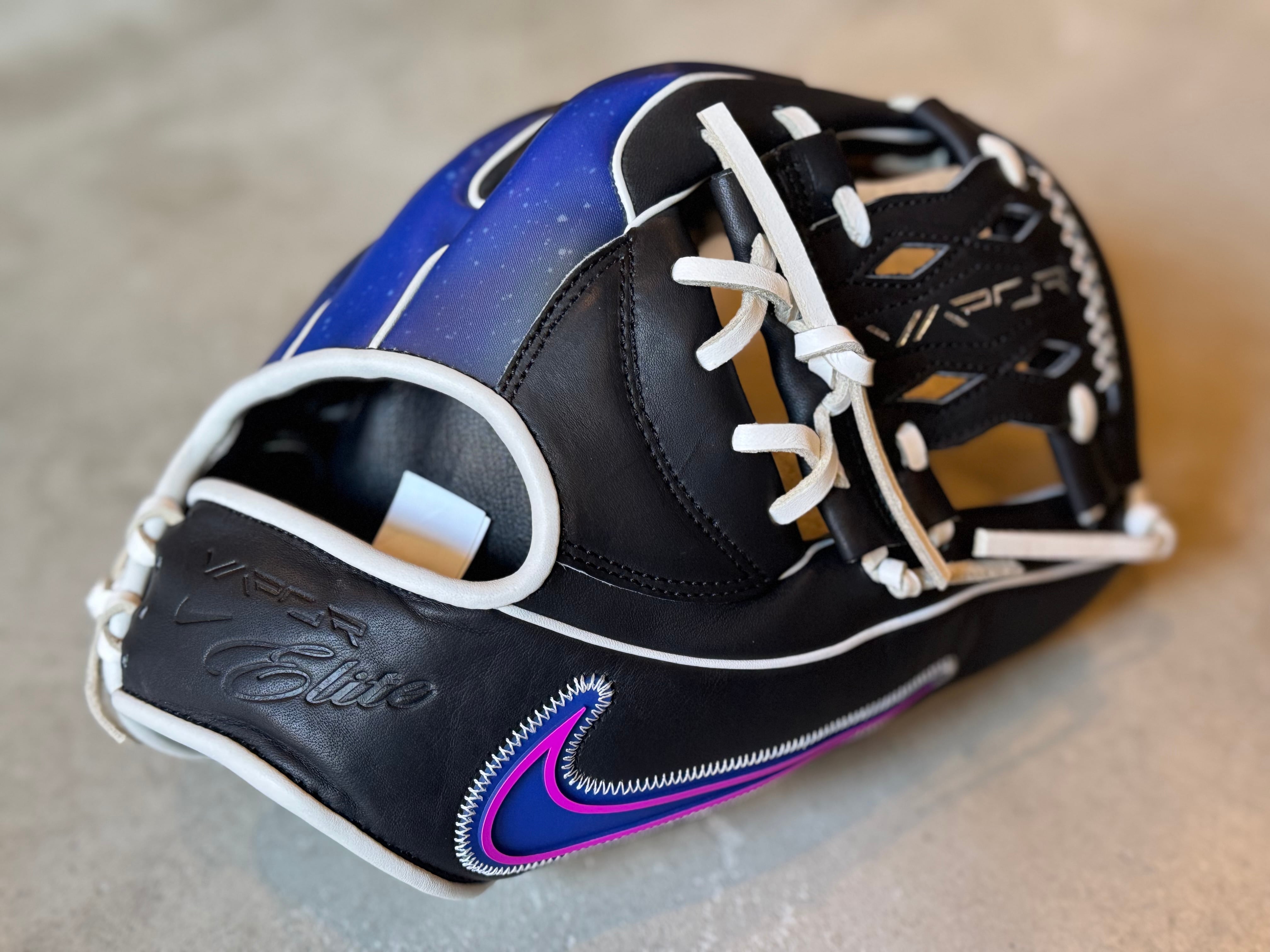 素材:牛革77%、ポリエステル10%、ポリウレタン8%、ポリエチレン5% 品番:BA2001 サイズ11.5インチ。プレイヤーに影響を与えるスネークアイウェブ採用! 耐摩擦性を追求した指先、型を支えるレザーパルムラップ、NIKEシューズにインスパイアされた合成シェル、究極の快適さを実現するパッド入りの内側親指ループ。捕球面を大きく広げられるワイドフォーム、型付けに適した牛革使用。 ポジション:オールラウンド用 本体カラー:ブラック×ホワイト×インディゴフォース ステッチカラー:ブラック ラベル:パープル×ネイビー 専用グラブ袋:無し ※送料無料 ※型付け有の場合、加工期間に1週間程度かかる可能性がございます。予めご了承下さい。 追加で確認する事項がありましたらメールにてご連絡する事がございます。 ※柔らかさの目安(個人差はございます) 「硬め」・・・形を整える程度。お客様ご自身で柔らかくしていくイメージ。 「普通」・・・キャッチボールが出来る程度。多少の開閉ができるイメージ。 「柔らかめ」・・・ノックなど受けれる程度。しっかり開閉できるイメージ。