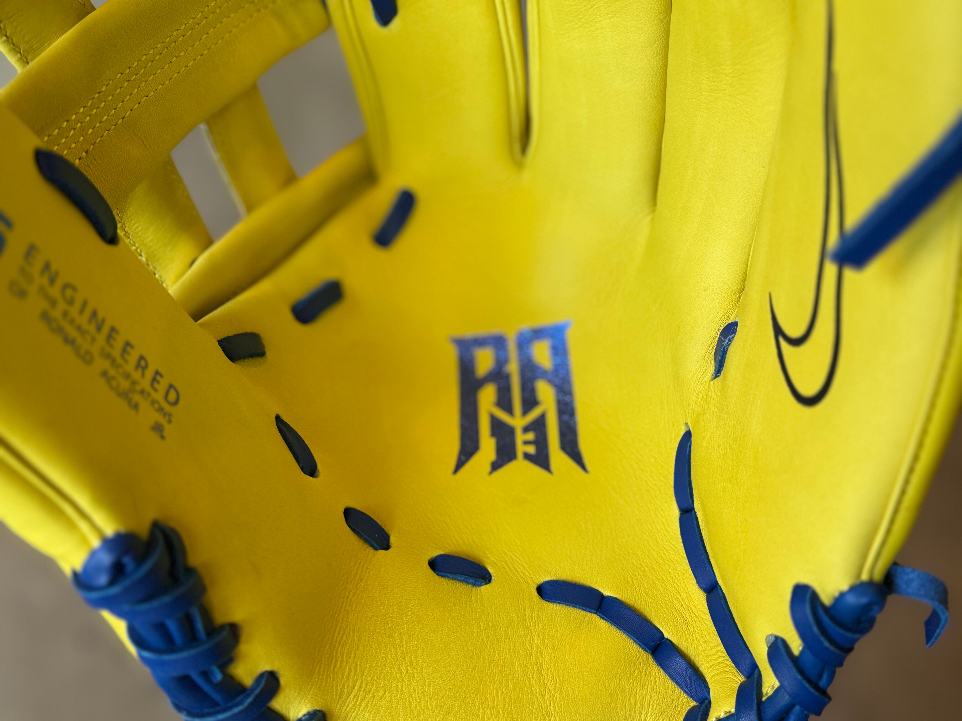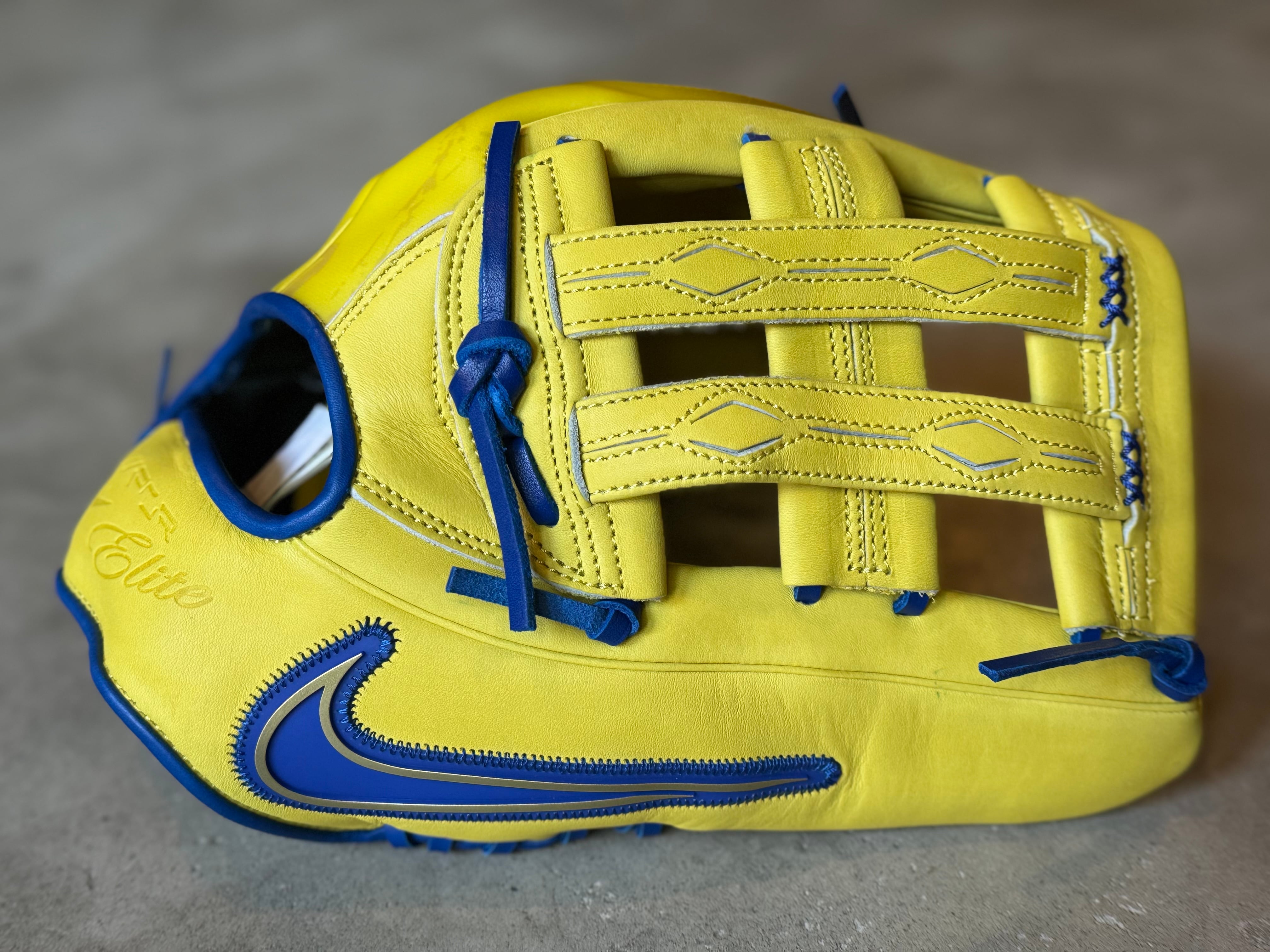 素材:牛革77%、ポリエステル10%、ポリウレタン8%、ポリエチレン5% 品番:BA2000 サイズ12.75インチ。プレイヤーに影響を与えるナイキオリジナルHウェブ採用! 耐摩擦性を追求した指先、型を支えるレザーパルムラップ、NIKEシューズにインスパイアされた合成シェル、究極の快適さを実現するパッド入りの内側親指ループ。捕球面を大きく広げられるワイドフォーム、型付けに適した牛革使用。 ポジション:外野手用 本体カラー:オプティイエロー×ハイパーブルー×ハイパーブルー ステッチカラー:イエロー ラベル:ゴールド×ブルー 専用グラブ袋:無し ※送料無料 ※型付け有の場合、加工期間に1週間程度かかる可能性がございます。予めご了承下さい。 追加で確認する事項がありましたらメールにてご連絡する事がございます。 ※柔らかさの目安(個人差はございます) 「硬め」・・・形を整える程度。お客様ご自身で柔らかくしていくイメージ。 「普通」・・・キャッチボールが出来る程度。多少の開閉ができるイメージ。 「柔らかめ」・・・ノックなど受けれる程度。しっかり開閉できるイメージ。