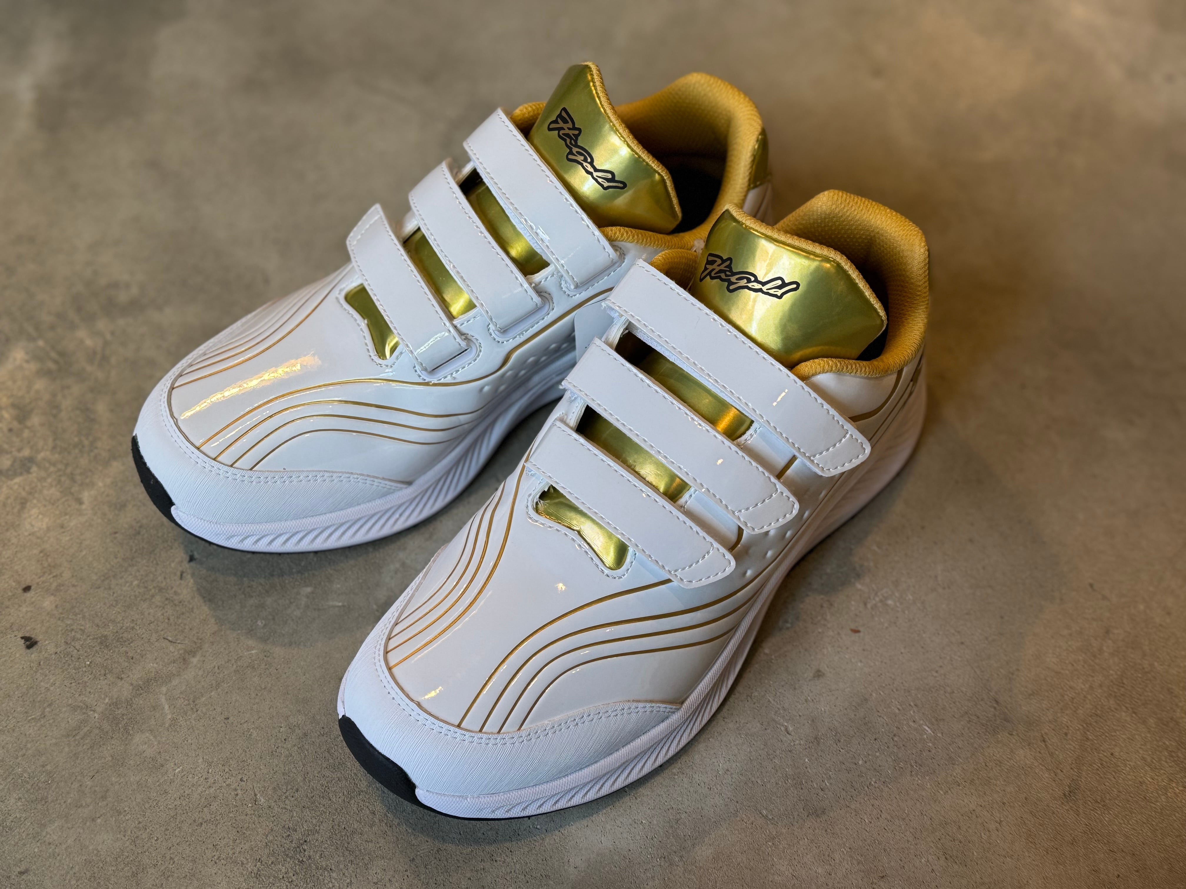品番:PU-1100GB 本体カラー:ホワイト×ゴールド サイズ:25.0〜29.0cm アッパー素材:人工皮革(エナメル) ソール素材:合成ゴム 横幅目安:2E ○つま先のトゥガードに耐摩耗性ラバーを設置し、当該箇所によるダメージを軽減。 ○一枚甲の仕立てで余計なパーツのステッチングを無くし、お手入れも簡単に‼︎