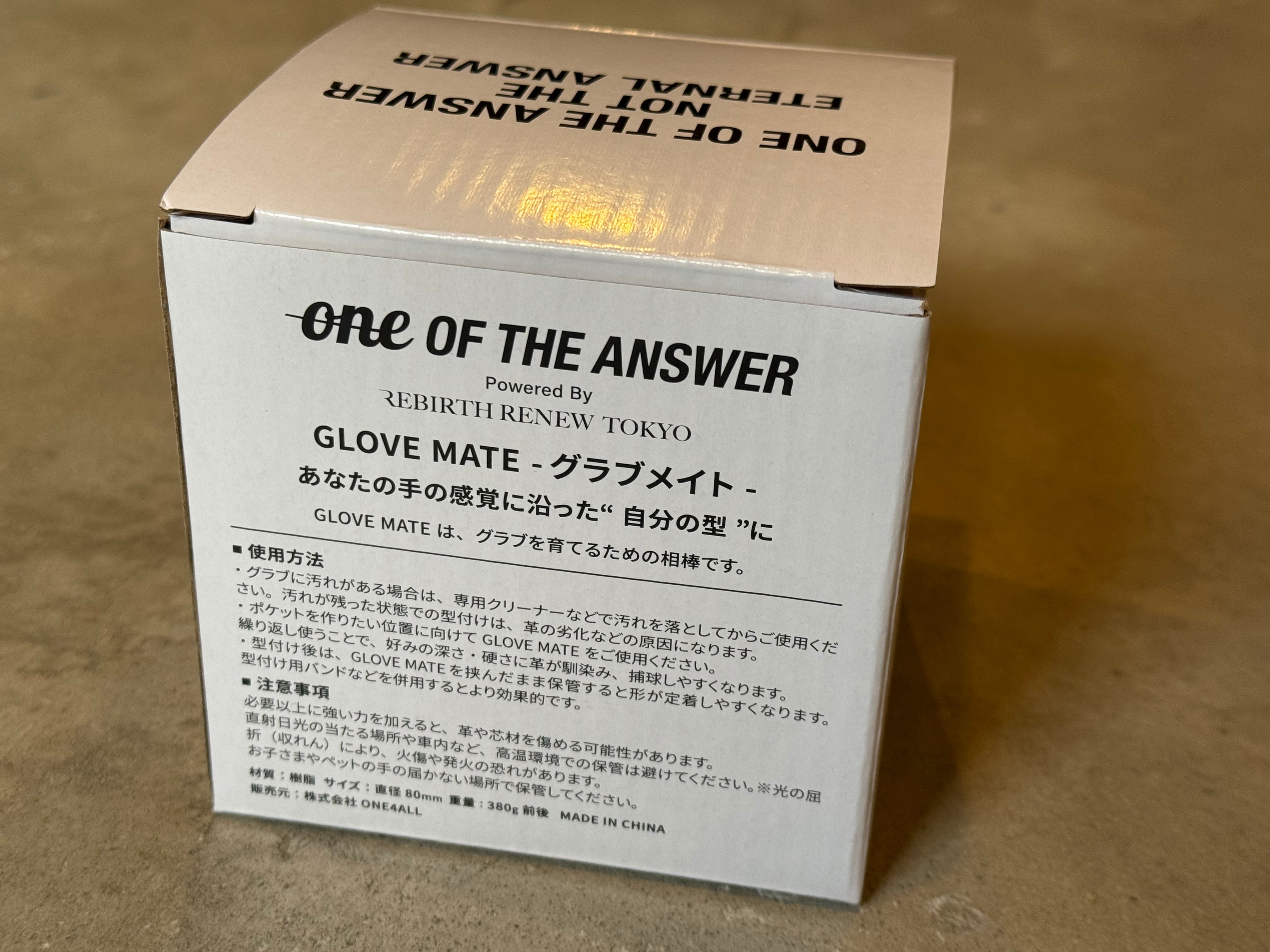 あなたの手の感覚に沿った“自分の型に” GLOVE MATEは、グラブを育てるための相棒です。 素材:樹脂 サイズ:直径80mm 重量:380g平均 生産国:中国 ◯使用方法 ・グラブに汚れがある場合は、クリーナー等 で汚れを落としてからご使用下さい。汚れが 残った状態での型付けは、革の劣化などの原 因になります。 ・ポケットを作りたい位置に向けて本品をご 使用下さい。繰り返し使うことで、好みの深 さ・硬さに革が馴染み、捕球しやすくなりま す。 ・型付け後は、GLOVE MATEを挟んだまま保 管すると形が定着しやすくなります。型付け 用バンドなどを併用すると効果的です。