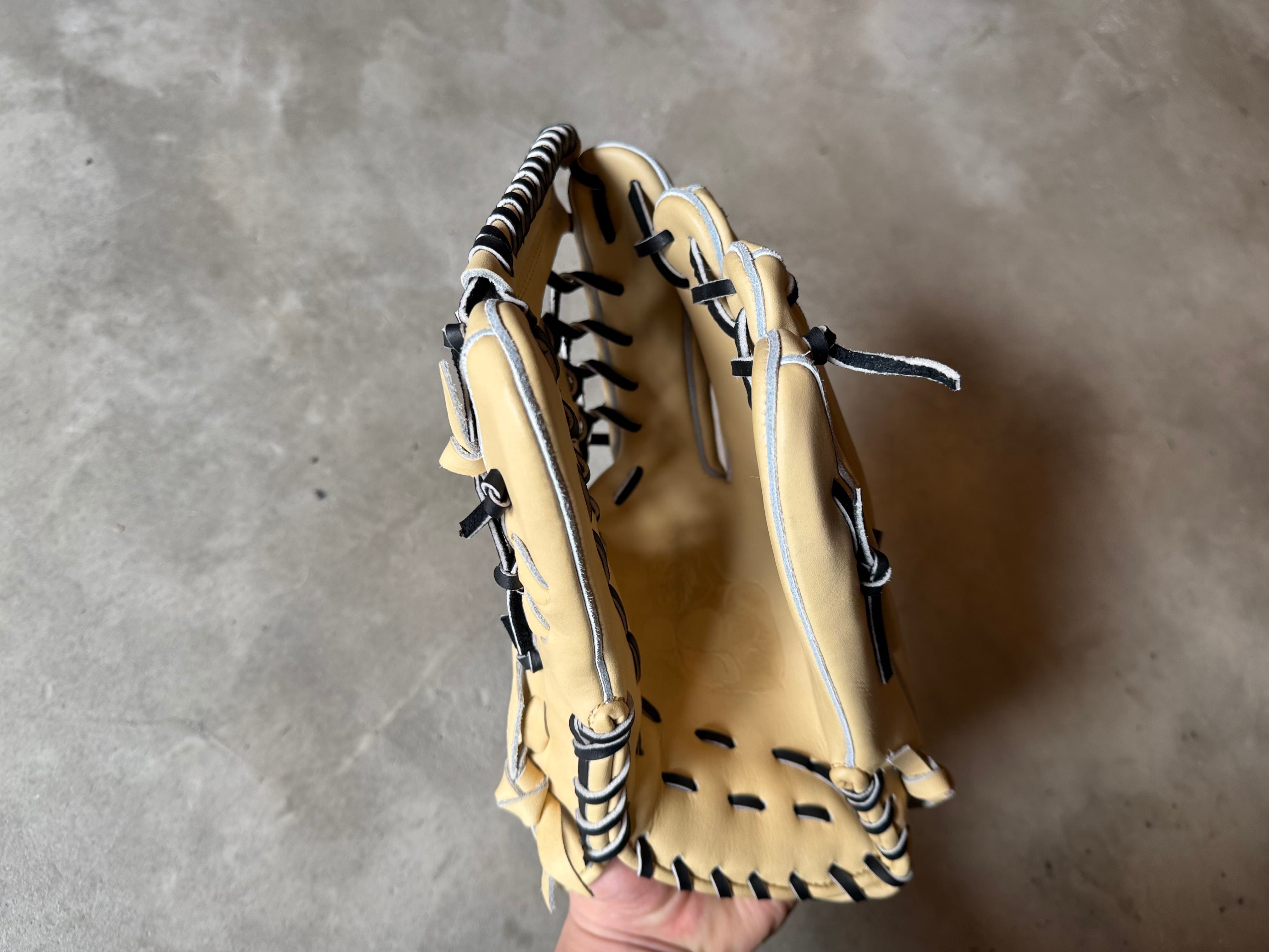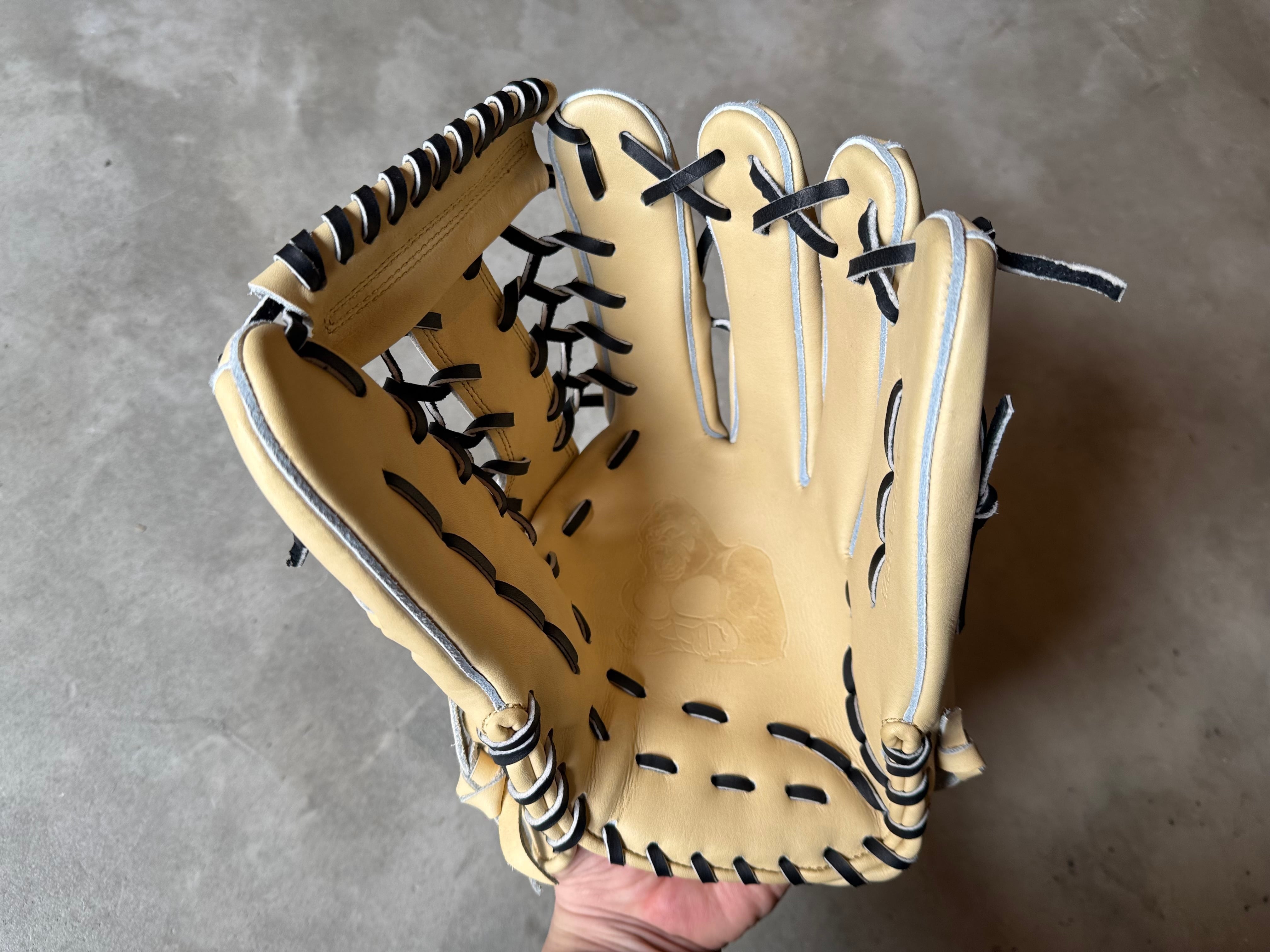 大きめの外野手用。33.0cm。深すぎず浅すぎないポケットで暴れを黙らせる。