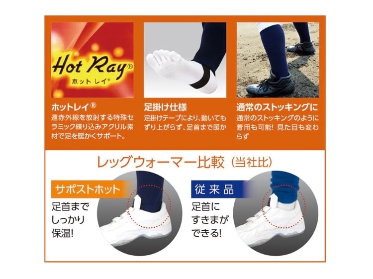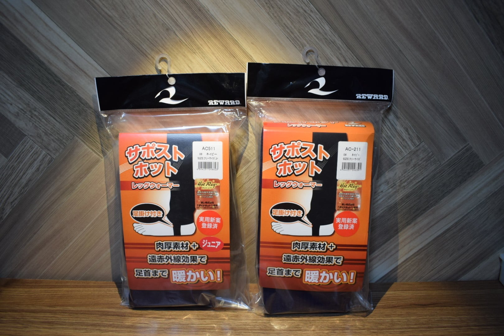 【REWARD】サポストホット 足掛け付きレッグウォーマー カラー:ネイビー、ブラック サイズ:大人用フリー 肉厚素材+遠赤外線効果で足首まで暖かい!!! ★ポイント★ ・肉厚素材により保温性アップ! ・遠赤外線を放射する特殊素材で暖かい! ・足掛け付だから足首まで暖かい! ・足掛け付だからずり上がらない! ・冬場の練習用ストッキングに最適! ・スポーツ観戦時の防寒対策に最適!