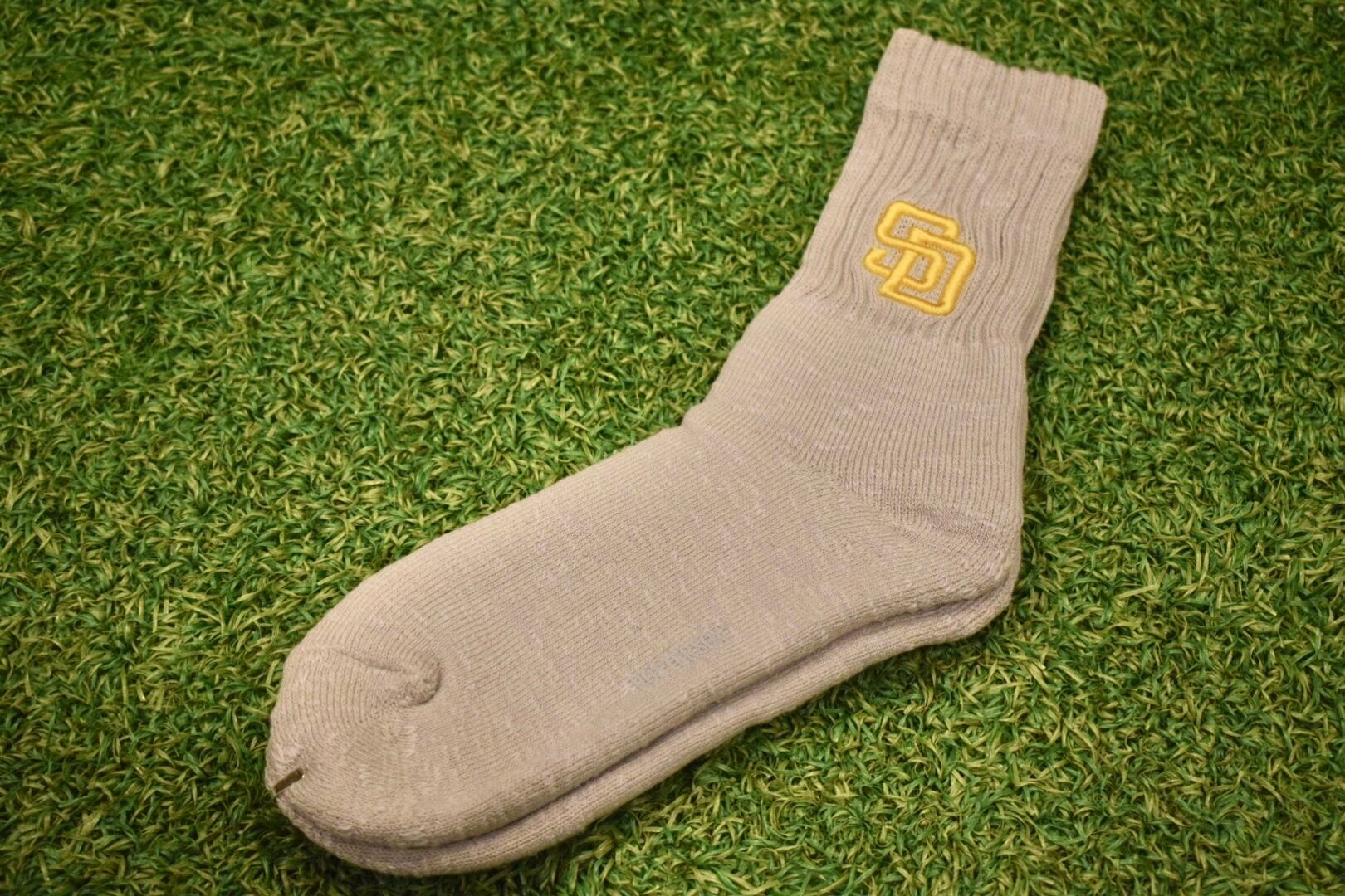 MLBやSDパドレスのロゴが入った、しっかりとした厚みのある生地感のソックス。
