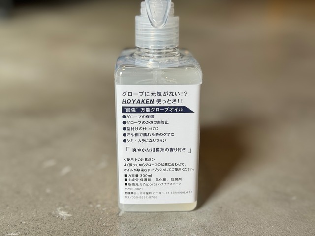 【87sportsオリジナル】HOYAKEN〜ほやけん〜[レザーファインオイル]革の栄養剤 主成分:保湿剤、乳化剤、防腐剤 容量:300ml 販売元:87sports ハチナナスポーツ 〜グローブに元気がない!? じゃあHOYAKEN(ほやけん)使っとき!!〜 ○グローブの保湿 ○グローブのかさつき防止 ◯型付けの仕上げに ○汗や雨で濡れた時のケアに ○シミ・ムラになりづらい 「爽やかな柑橘系の香り付き」 〈使用上の注意点〉 よく振ってからグローブの状態に合わせて、オイルが馴染むまでプッシュしてご使用下さい。 ※砂や汚れをしっかり落としてからご使用下さい。