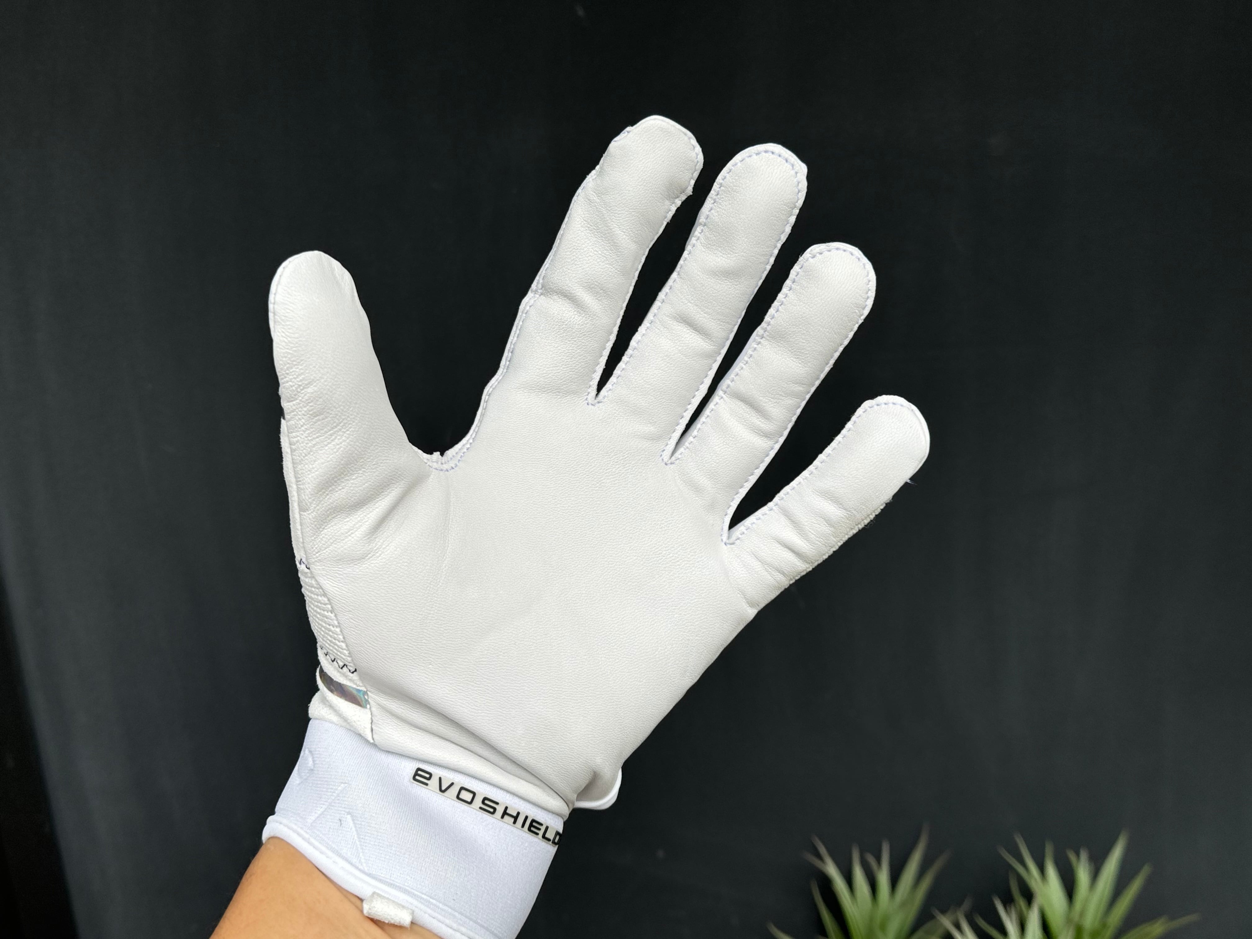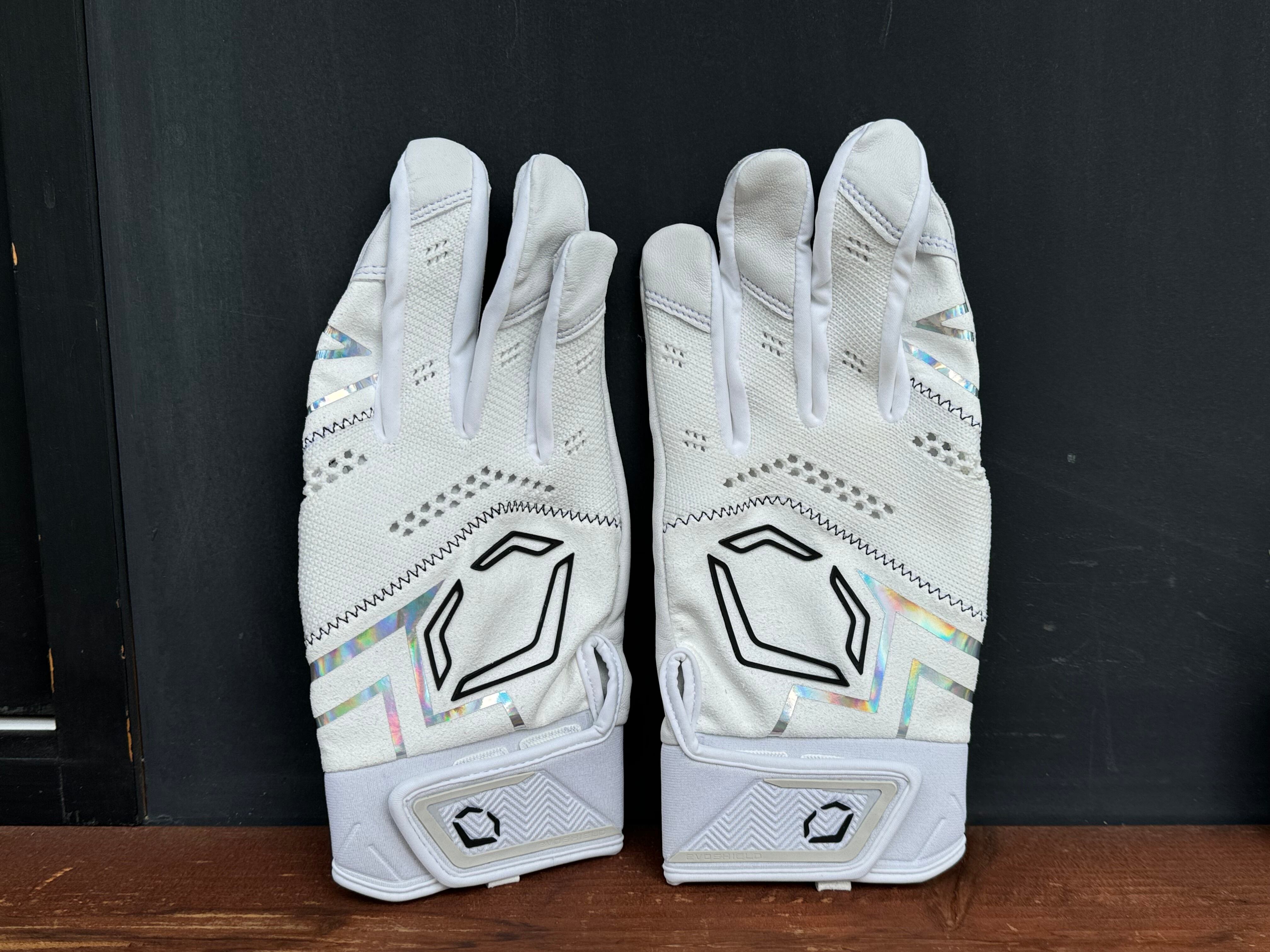 【evoSHIELD】バッティンググローブ 両手用 優れたグリップ力と耐久性を兼ね備えたハイパフォーマンスシープモデル。 PRO-SRZ V2 品番:WB57305 カラー:(05)ホワイト サイズ:S、M、L、XL 素材:羊革、ナイロン、合成皮革、PU、ポリエステル(インドネシア製) 甲側にパフォーマンスニットバックハンドを採用することで伸縮性と通気性を追求。