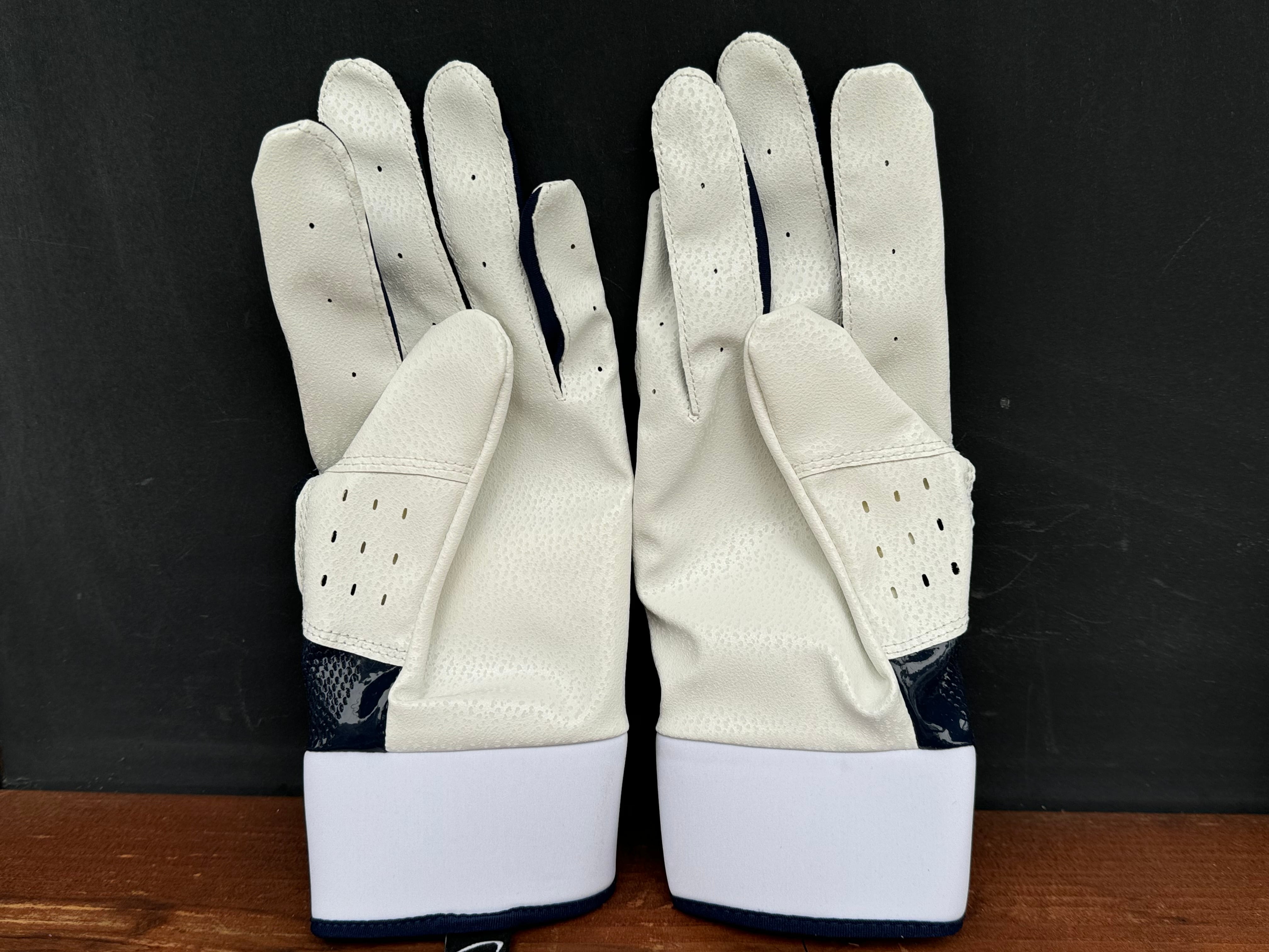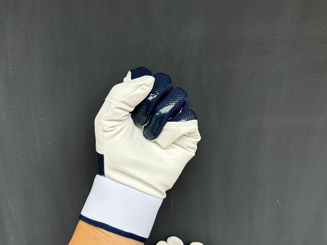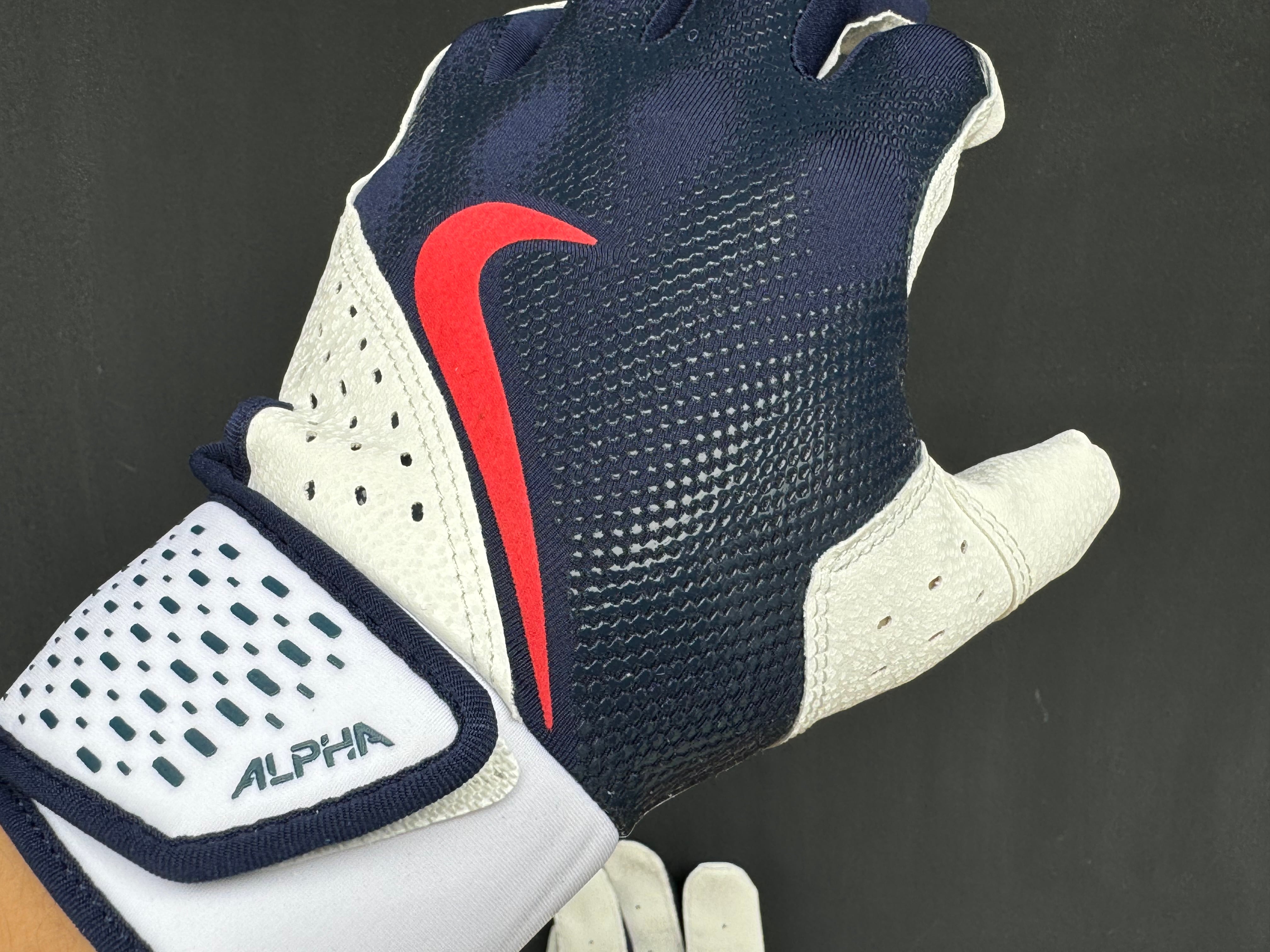 【NIKE】Alpha バッティンググローブ 両手用 品番:BA1030 カラー:(420)ミッドナイトネイビー/ホワイト/ユニバーシティレッド サイズ:S、M、L 素材:手のひら ポリエステル55%合成皮革45% 手の甲 ポリエステル83%、合成皮革9% スパンデックス8% その他 ネオプレン44% ポリエステル42%、ナイロン9% スパンデックス5% 耐久性のある合成皮革を使用し、カフ部分でしっかりとしたフィット力を提供。