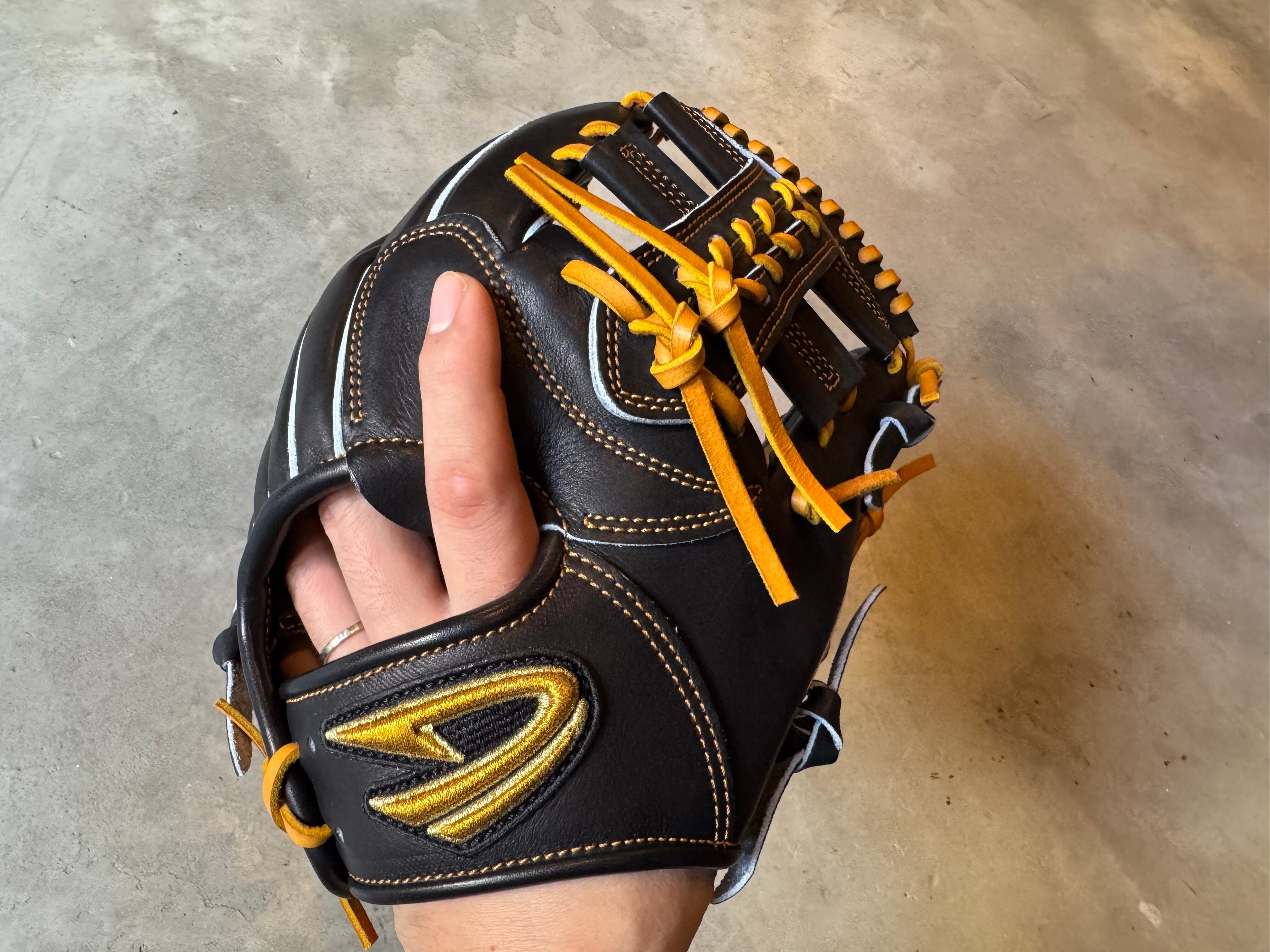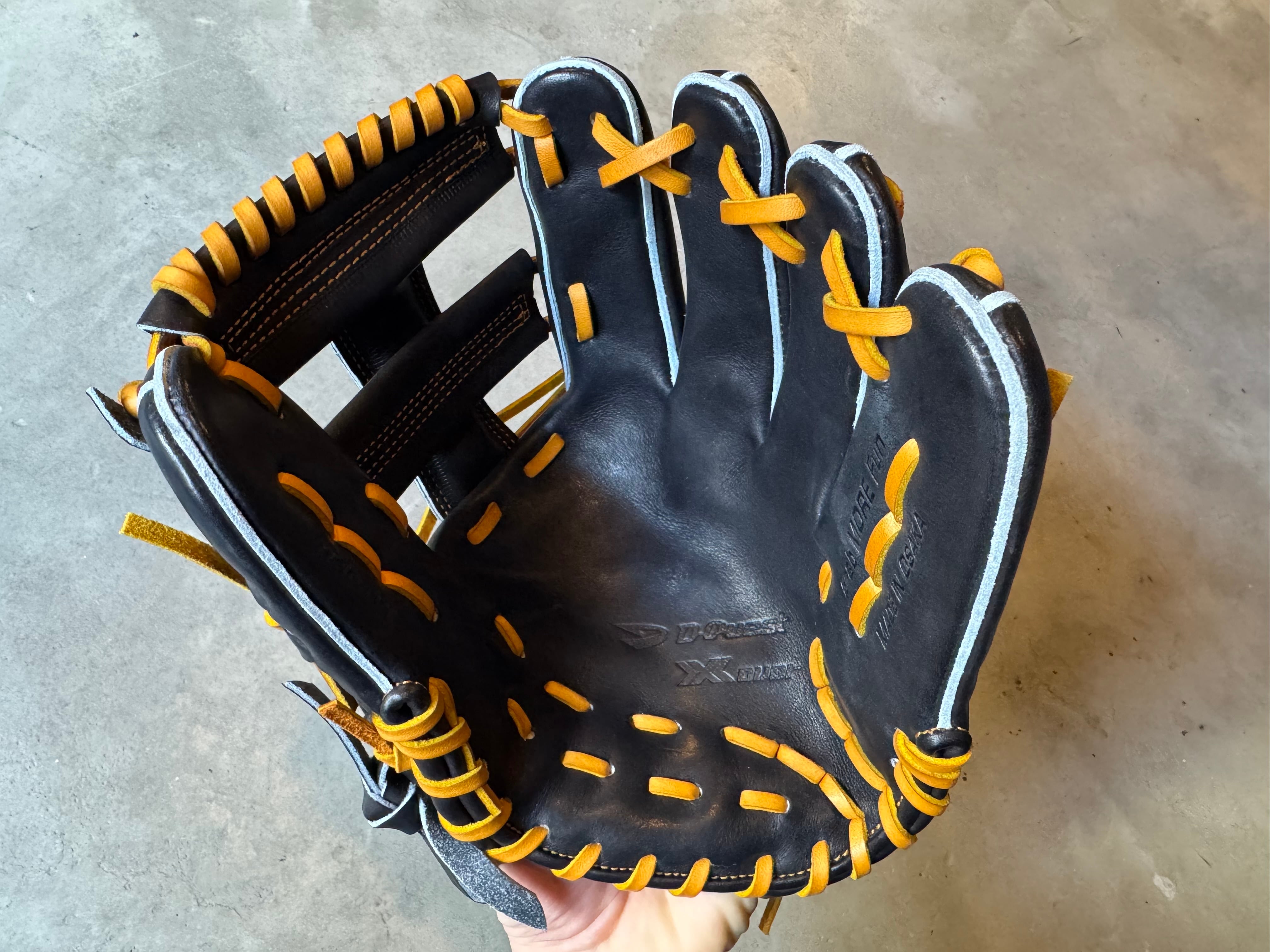 Xover Series (クロスオーバーシリーズ) Leather“JT” 【D-Quest】硬式用グローブ ※写真7〜8枚目は型付けイメージです。 〜新構造“SEAMLESS”がクセになる。〜 指出しをスムーズにするのはもちろん、あると無しじゃ捕球感も違う。言葉では説明しにくい独特な感覚だが間違いない仕様です。 型番:XOJ-161S サイズ約29.0cm ボールをしっかり包み込むことができる設計。 自然な手の動きで捕球することが可能で、スムーズなスローイングへと移行しやすいモデル。 ポジション:内野手 本体カラー:ブラック 紐カラー:タン ステッチカラー:タン ラベル:ゴールド×ブラック 専用グラブ袋:有 高校野球使用:可 ○昨年から継続してリリースされた“Xover”シリーズ 2種類の良質な皮革を採用。 同じ形状に見えても、その違いはまるで別物。ファクトリーブランドだから実現する銘革をベストな状態に仕上げる職人技が集結。 ○Xover Series “JT” Leather 手に吸い付く相棒。馴染みやすくへたりにい。“JT” その革は皮革繊維の密度が高いので、よく馴染みへたりにくい。独特な艶感も使えば使うほど輝きを増します。 選手にとってベストな状態が早くきて長く続く性質を持つ。まさに選手の相棒。 柔らかくグラブを使いたい方も、いい状態が続く愛着のわくグラブです。 ○新講造“SEAMLESS” 人差し指を出して使用する選手に向けてスムーズな指出しを実現。 使えば使うほど手に馴染み、共に成長していくこのグラブで、ファクトリーブランド D-questのものづくりに対する思いの強さをご体感ください。 D-Questは世界で活躍する一流選手のグラブをつくる工房。 その職人が編んだグラブで、軽快な捕球と成長をサポートします。 ※送料無料 ※型付け有の場合、加工期間に1週間程度かかる可能性がございます。予めご了承下さい。 追加で確認する事項がありましたらメールにてご連絡する事がございます。 ※柔らかさの目安(個人差はございます) 「硬め」・・・形を整える程度。お客様ご自身で柔らかくしていくイメージ。 「普通」・・・キャッチボールが出来る程度。多少の開閉ができるイメージ。 「柔らかめ」・・・ノックなど受けれる程度。しっかり開閉できるイメージ。 ※グラブ刺繍は、平裏土手部のみ可能。ご利用の際はグラブ刺繍ページをご確認下さい。 (メニューバー→カテゴリ→グラブ刺繍)